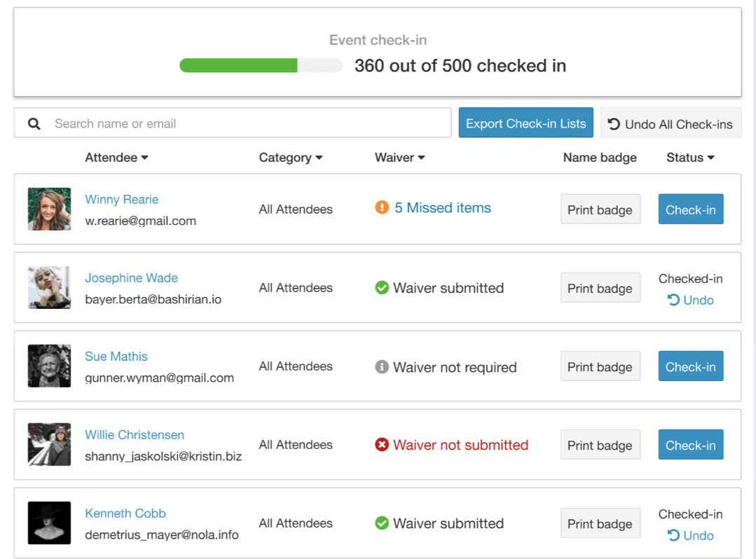 On event day, it’s easy to make sure only attendees who have filled out the proper paperwork check in — when checking attendees in on both desktop and mobile, you can view whether each attendee’s waiver has been submitted as well as viewing which items they didn’t check.