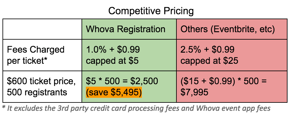 Yes, Whova supports free tickets without charging any ticket fees. There is no limit to the number of free tickets you can distribute through Whova. Additionally, Whova’s event registration system is bundled with the mobile event app and event management software at affordable prices. You can save thousands of dollars in event expenses and hundreds of hours of manual work.