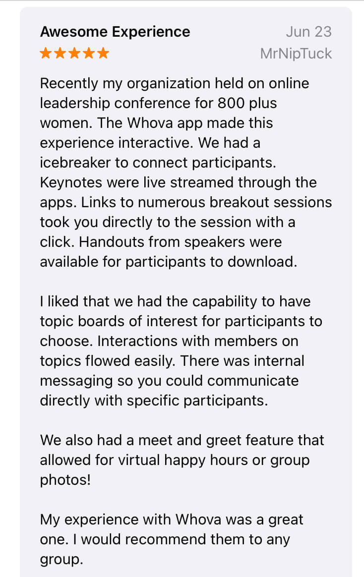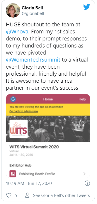 HUGE shoutout to the team at @Whova. From my 1st sales demo, to their prompt responses to my hundreds of questions as we have pivoted @WomenTechSummit to a virtual event, they have been professional, friendly and helpful It is awesome to have a real partner in our event's success pic.twitter.com/W9xj8IAlRi